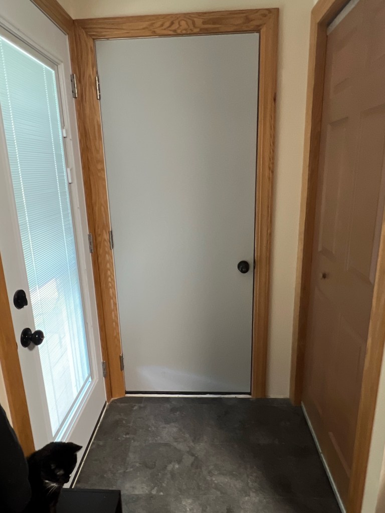 This hallway had 3 doors: External door to the back yard, Garage door, Bi-Fold door leading to basement. All three were replaced with matching moldings.