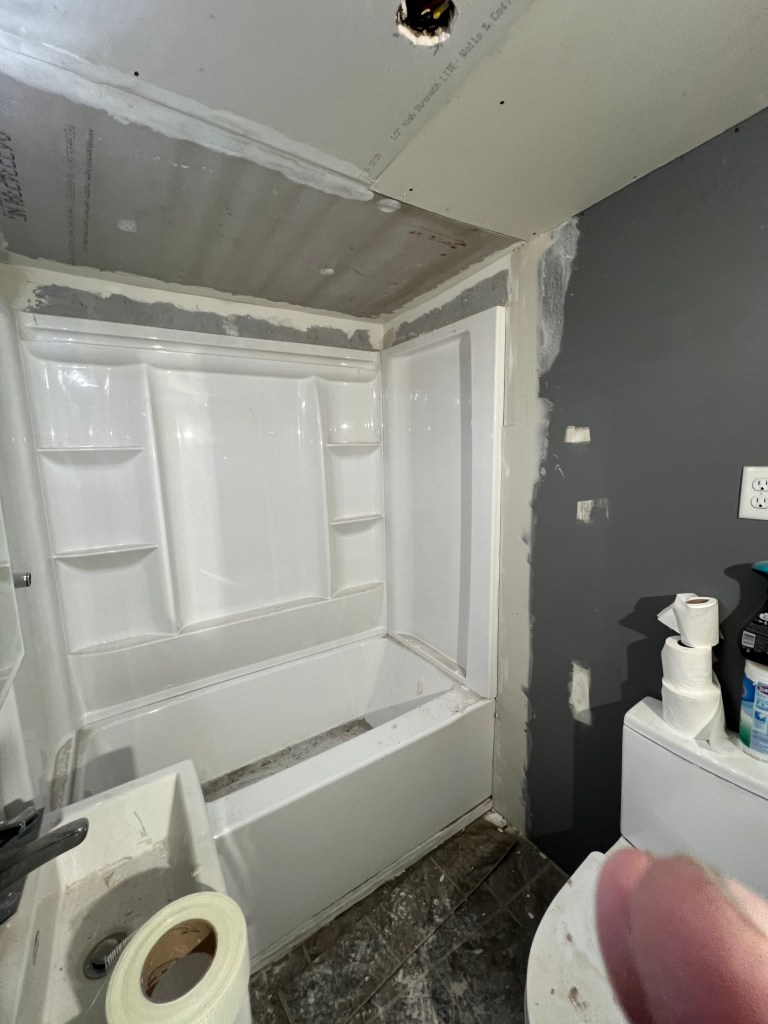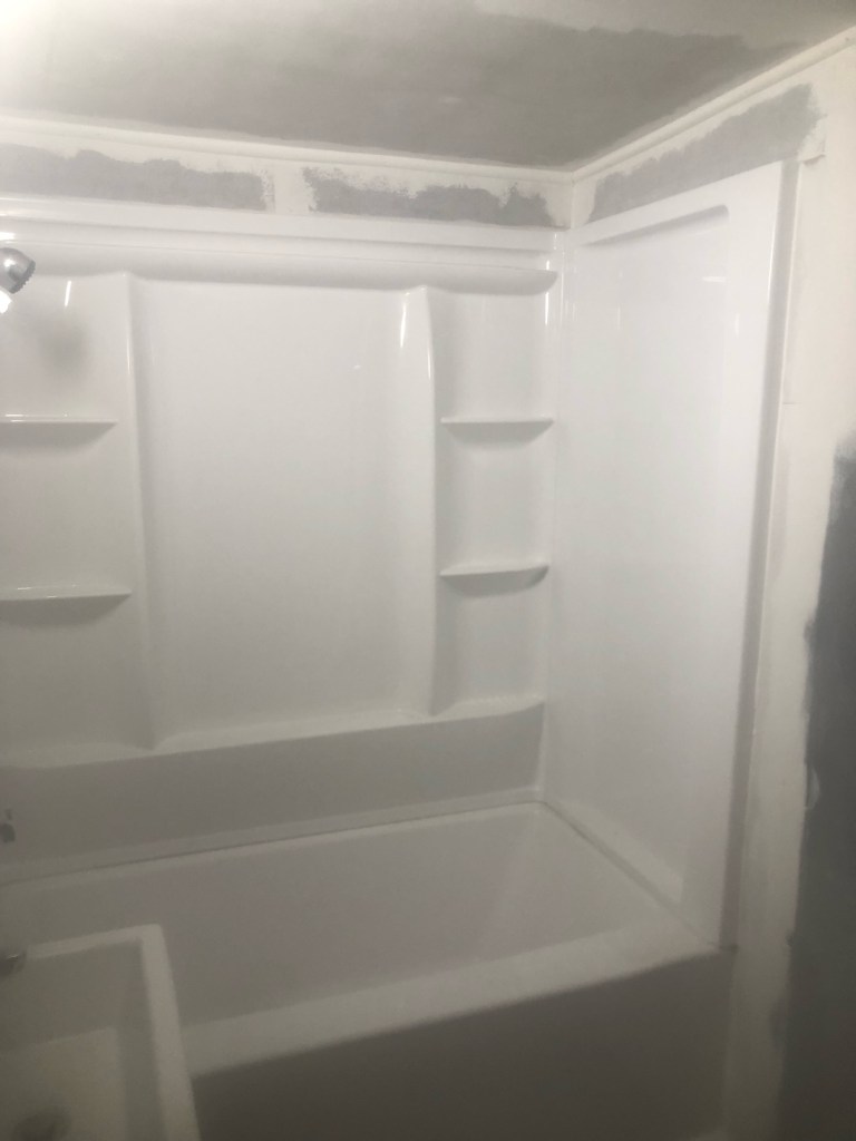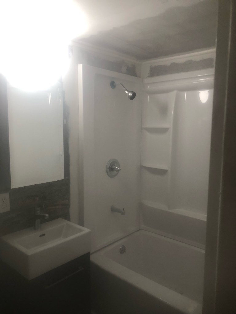 A Customer started their own bath remodel but needed help to finish. The renovation was extensive. The owner enclosed an outside area to increase the homes interior. Then increased the bathroom size and started to install a bath tub with pre-fabricated shower walls but needed help to finish the job. The first two photos show the bath renovation before help arrived. The next two phots show some work in progress, followed by the final two photos showing the completion of the major work.